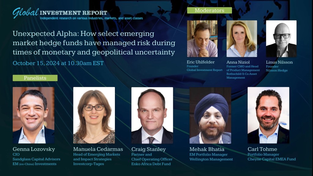 On October 15th, at 10:30 EST I’m honored to be co-moderating this remarkable panel of EM experts. They include some of the most consistently performing hedge managers to be found across the entire hedge fund industry along with a leading global allocator who helps direct emerging market and impact investments.